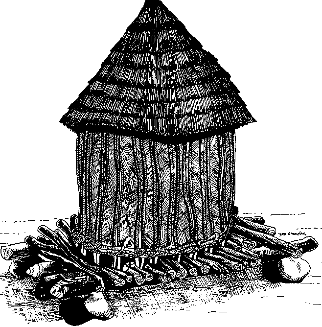 Ce grenier (figure B.7), qui ressemble beaucoup à ceux des ethnies Dogon et Bwaba, consiste en une plate-forme, faite de trois poutres maîtresses et d'un plancher de traverses en bois, le tout reposant sur six ou neuf grosses pierres.