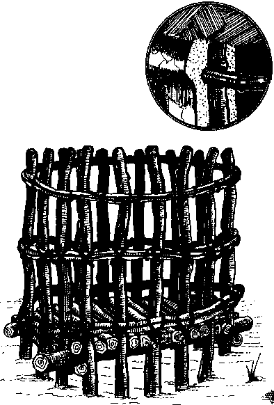 Chez les Gourmantché, aussitôt après le préstockage au champ, les récoltes sont stockées en épis dans des greniers en paille. Le grenier typique, appelé Bwabwari, est constitué d'une ossature en branches provenant normalement d'arbres dont le bois est résistant aux termites (cf. figure B.2). Les villageois utilisent de préférence Acacia senegal (Likongouabi en gourmantché) ou Dalbergia melanoxylor (Siébou en gourmantché, ou ébène du Sénégal). Deux grands seccos (7 m de long sur 1,50 m de large, chacun) superposés et attachés de l'intérieur à l'ossature, forment les parois du corps du grenier. Trois petits seccos (4 m x 1,50 m) superposés forment le plancher et reposent simplement- sur la plate-forme. Un toit conique, fait d'une couche de deux petits seccos recouverts de paille, protège l'ensemble du grenier (cf. figure B.1).