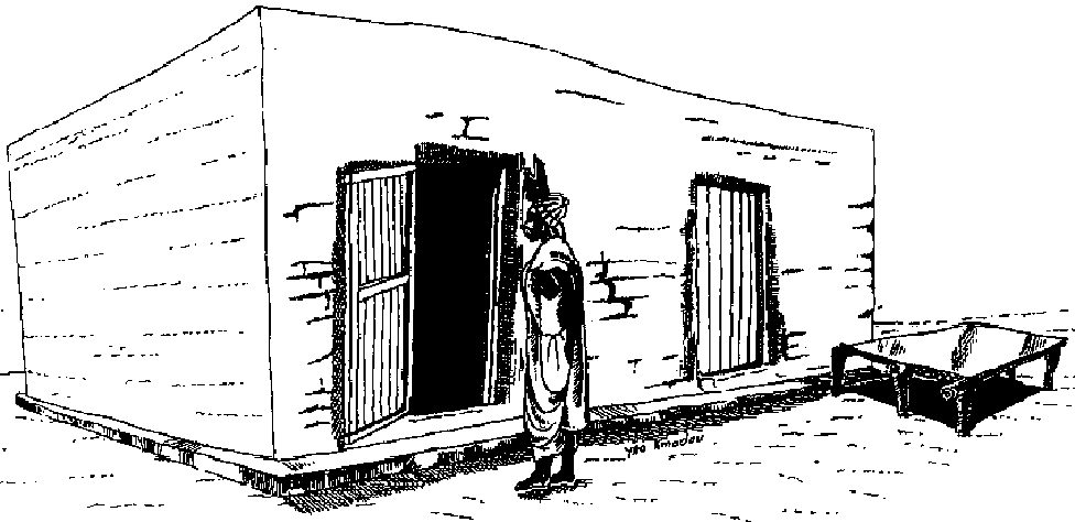 Figure 1.2: Nouvelle structure de stockage, appelée magasin (Sine-Saloum, Sénégal oriental et Casamance). Remplace malheureusement le grenier traditionnel dans certaines régions. Stockage en épis ou en grain battu dans des sacs posés à même le sol.