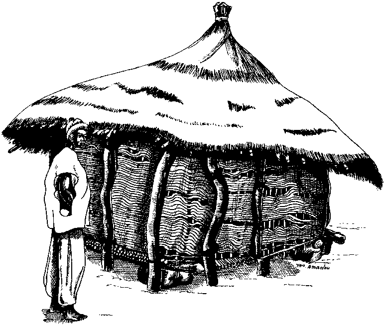 Chez les Diakhanké, le grenier traditionnel typique, appelé Kouroukoro, est entièrement construit en matériaux végétaux. Cependant, depuis une vingtaine d'années, sont apparues des structures nouvelles où le stockage en épis est fait à même le sol. Il s'agit de magasins aux murs de banco, parfois même en ciment, avec une toiture de tôle ondulée (cf. figure 1.2). Dans le village de Missira, près de Tambacounda, des cases construites sur le même modèle que les habitations, c'est-à-dire avec des murs de banco et une toiture en paille, sont également utilisées pour le stockage en vrac des épis à même le sol.