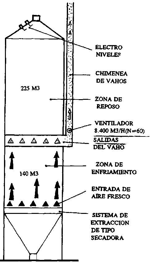 Estos silos, llamados "enfriadores continuos", como se ilustra en la Figura 81, están formados por una cámara superior que recibe el grano proveniente de la secadora y donde éste va descendiendo al tiempo que sufre el período de reposo. Luego llega a la zona de enfriamiento que tiene caballetes similares a los de una secadora, por lo que desciende el grano y recibe la corriente de aire en forma de contracorriente (de abajo hacia arriba).
