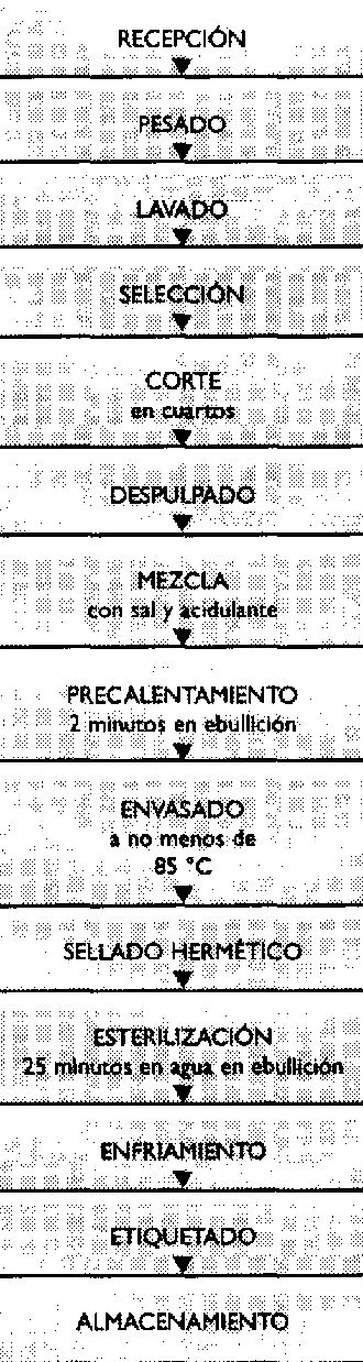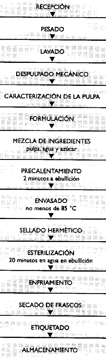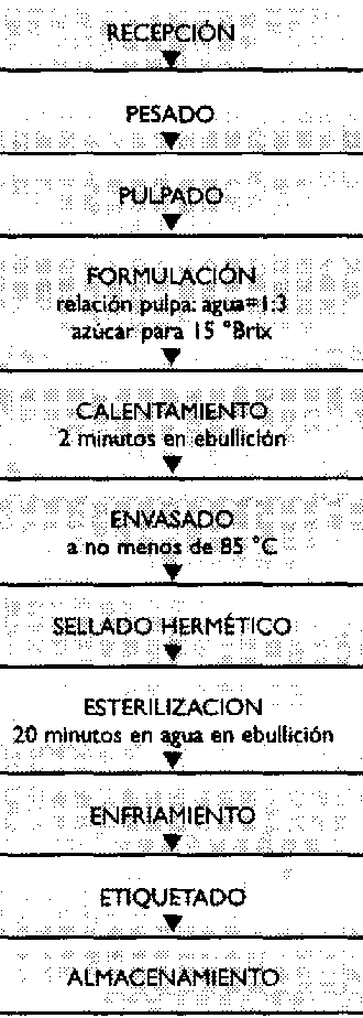 La mezcla, como siempre, se somete a un calentamiento en ebullición y se envasa en caliente, se sella herméticamente y se esteriliza. Luego de enfriar, se secan los envases y se etiquetan. En la Figura 53 se muestra el diagrama de flujo para el proceso. Algunas operaciones de este proceso se pueden apreciar en las fotografías 206 a 209.