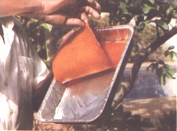 Distribución de la mezcla de mango y maracuyá en bandejas (G. Paltrinieri)
