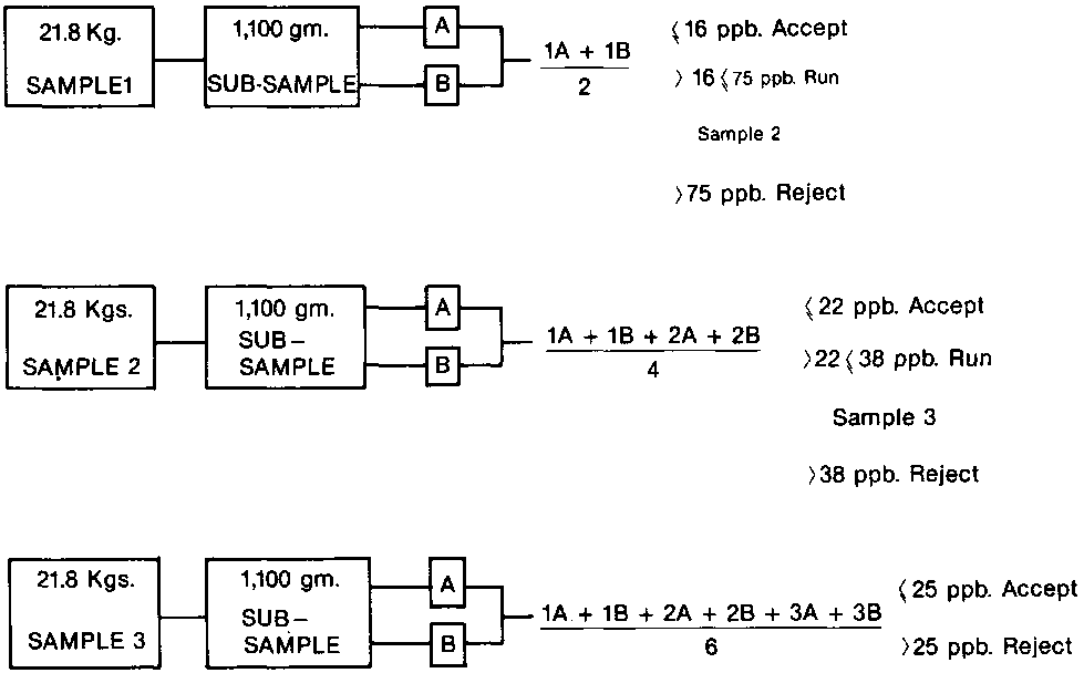 Since the recognition of the aflatoxin problem, it has generally been the practice to require at least 1 kg. samples; and the U.S. Food and Drug Administration has advocated a minimum of a 15 lb. (6.8 kg.) sample. The size of the lot under investigation usually does not affect the random variability associated with sampling if the sample size is small compared to the size of the lot. A properly drawn 48 lb. sample is as representative of a 100,000 lb. lot of raw shelled peanuts as it is for a 40,000 lb. lot. Over the years, the size of the sample for the control of aflatoxin in peanuts in the United States has risen from 12 Ibs. (5.4 kg.), to 24 Ibs. (10.9 kg.), to 48 Ibs. (21.8 kg.), to the current 144 lb. sample (three 48 lb. samples). This increase in size evolved as more reliable test results were required by the manufacturer. Increasing sample size has the advantage of simultaneously reducing the number of good lots rejected and the number of bad lots accepted by a testing program.