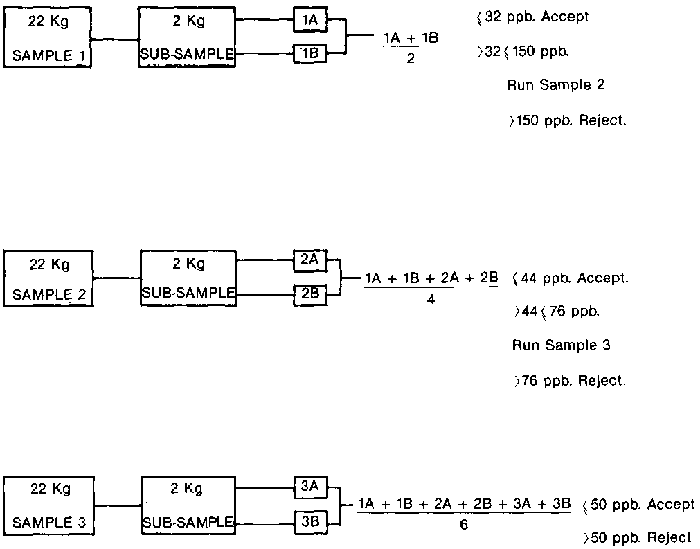 When the above described scheme is applied, the probability of acceptance calculated according to the method and on the basis of the distribution of Aflatoxine B. in peanuts as described by J. Walbel in his article "Stichprobengrosse fur die Bestimmung von Aflatoxin in Erdnüssen", in Deutschen Lebensmittel-Rundschau (vol. 73, nr. 11, November 1977, page 353 t/m 357), is as follows.