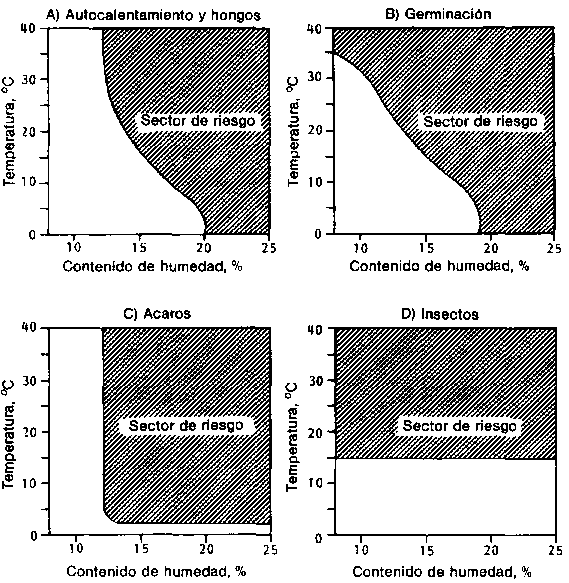 La temperatura y el contenido de humedad son los dos factores que se ha aprendido a controlar para evitar el deterioro durante el almacenamiento. En la Figura 6.1 se representan combinaciones de estos factores, que se han demostrado eficaces para un almacenamiento sin riesgos contra agentes concretos. En la Figura 6.2 se muestra el efecto combinado.