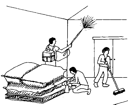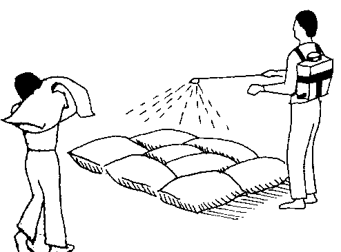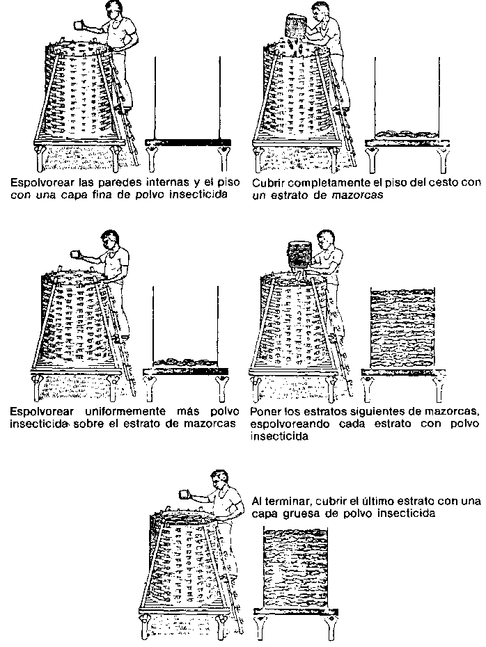 El rociado o espolvoreado de los estratos de sacos con insecticidas (según se muestra en la figura) es menos peligroso para las personas, pero no siempre resulta muy eficaz. No obstante, últimamente, con la aplicación de pirimifos-metilo (como concentrado emulsionable, Actelic 50 ec) sin diluir (50 EC) en dosis de 2 ó 3 pasadas por saco, con un aplicador doméstico sencillo, se eliminaron casi completamente los gorgojos en sacos de maíz muy infestados, y se mantuvo controlada la población a un nivel muy bajo incluso después de ocho meses. Pero la aplicación de insecticidas no diluidos constituye siempre un peligro.