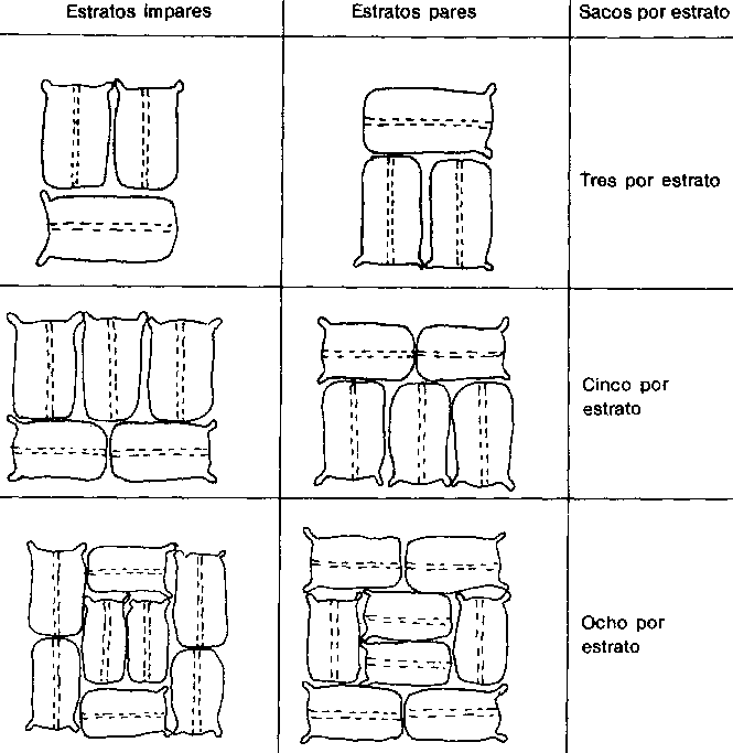 Los sacos se apilan generalmente en estratos de tres, cinco u ocho sacos por estrato. En la figura 7.10 se muestra la disposición de los sacos en los estratos impares y en los pares.