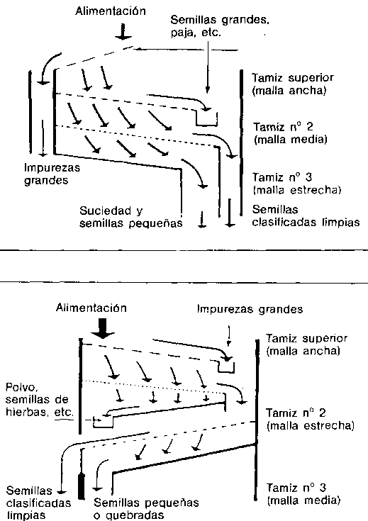12.2.1 Tamizado. Las impurezas se separan sobre la base de sus diferencias de tamaño con respecto al grano. Los tamices manuales se utilizan generalmente uno por uno, mientras que las máquinas más sencillas disponen de dos tamices: uno con orificios de gran tamaño (que retiene impurezas de gran tamaño y deja pasar los granos de cereal) y otro con orificios más pequeños (que retiene los granos pero deja pasar impurezas más pequeñas).