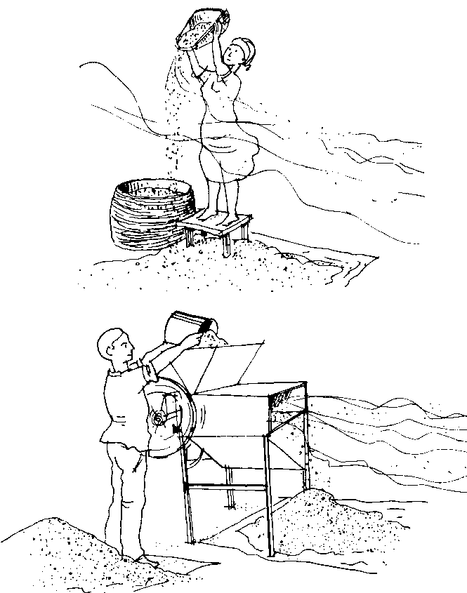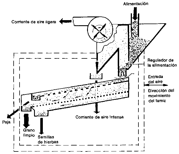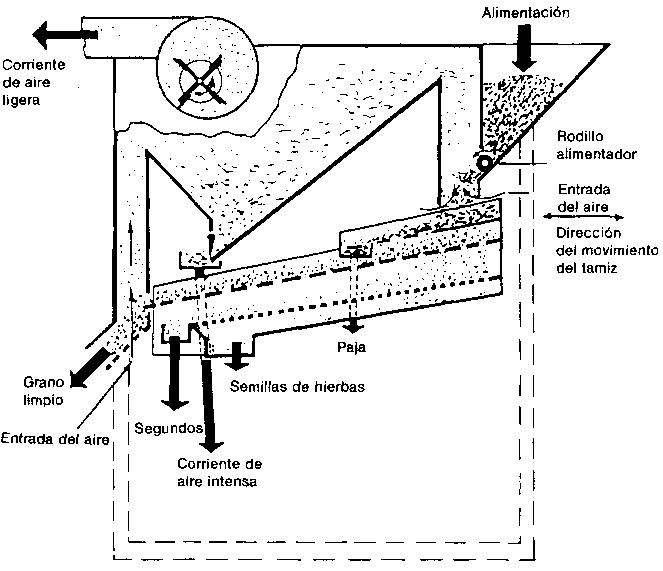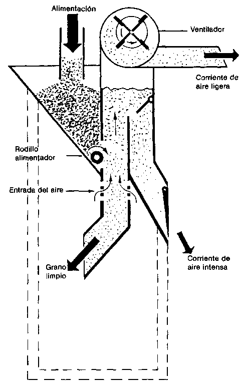 12.2.2 Aventado. En este proceso se separan las impurezas tomando como base sus diferentes densidades con respecto a las de los granos de cereal. La operación consiste en aprovechar una corriente de aire para separar las fracciones más ligeras. El método más sencillo es el de hacer caer una cestada de granos e impurezas, en chorro delgado, a una superficie limpia y en medio de una ligera brisa natural. Es un proceso lento y laborioso pero que aún se practica ampliamente.