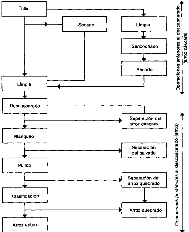 En la Figura 13.1 se indican las diversas fases de elaboración del arroz, que abarcan las operaciones desde la cosecha de la panícula hasta la producción del arroz blanco clasificado y pulido