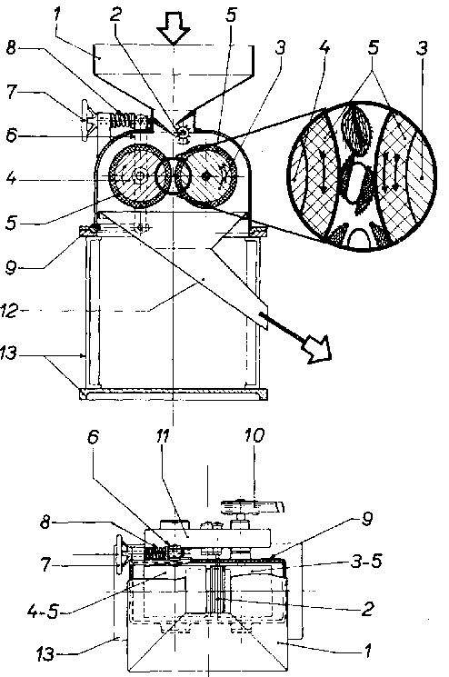 1. Tolva de alimentación; 2. Rodillo de alimentación; 3. Rodillo de movimiento rápido; 4. Rodillo de movimiento lento; 5. Superficie de caucho; 6. Brazo regulador de los rodillos; 7. Manilla para regular la luz entre los rodillos; 8. Muelle de compresión; 9. Cubierta; 10. Polea motriz; 11. Cubierta del equipo de accionamiento; 12. Conducto de salida; 13. Base y armazón. Ampliación: separación de la cáscara entre rodillos.