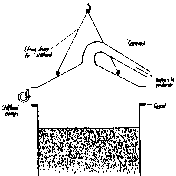 i. "Hydrodistillation" - in this method the charge (which is usually comminuted) is immersed totally in water which is boiled. The stills are of the simplest type (see Figure 1: Simple still hydrpdistillation) and are used extensively by smallholder producers of essential oils. Often they are heated over an open fire. The disadvantages are that the heat is difficult to control and hence the rate of distillation is variable. Also the possibility exists for local overheating and "burning" of the charge which can lead to a poorer quality oil. Improved distillation control can be obtained by using steam from a separate boiler, which is passed into a jacket around the still or through a closed coil in the bottom of the still, to heat the contents of the still. A further disadvantage of this system is that it requires the heating of a large quantity of water adding to costs and time needed for each distillation. However, it is necessary for certain flower distillations e.g. rose and ylang. It is also necessary for the efficient distillation of certain woody materials e.g. sandalwood and cinnamon bark.