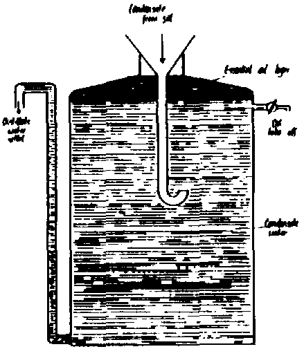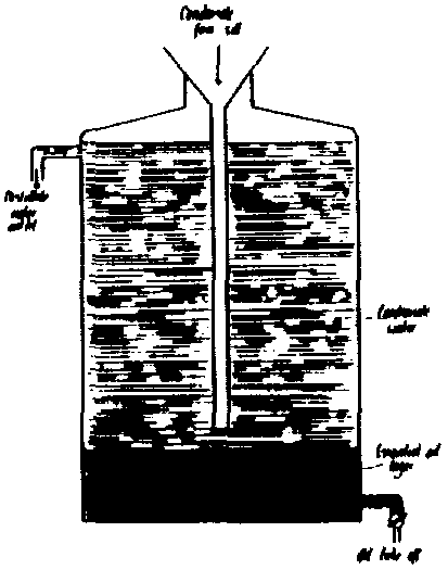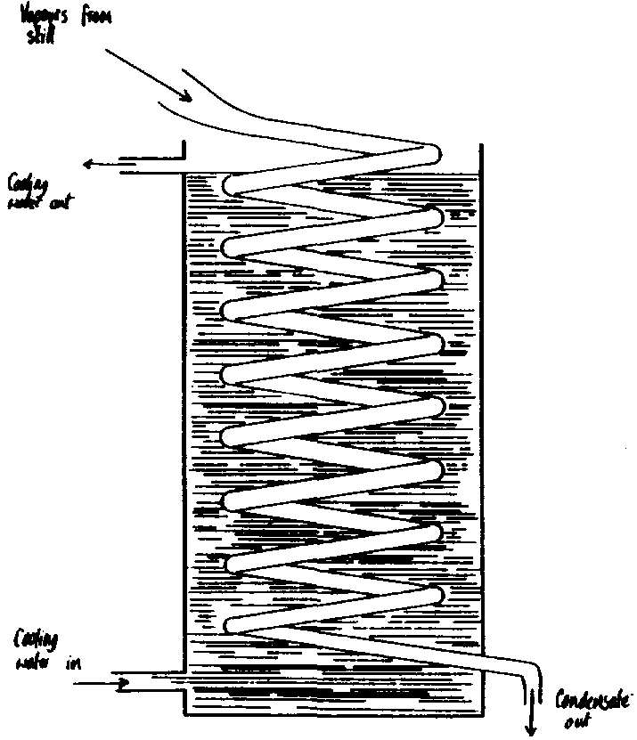 In the condenser the vapours are cooled and condense. The simple form of condenser is shown in Fig. 5. (see Fig. 5. Coil condenser). The vapours pass through a coiled tube contained in a water bath and condensate is obtained at the bottom of the condenser tube. It is important that condensation is complete or oil may be lost by evaporation.