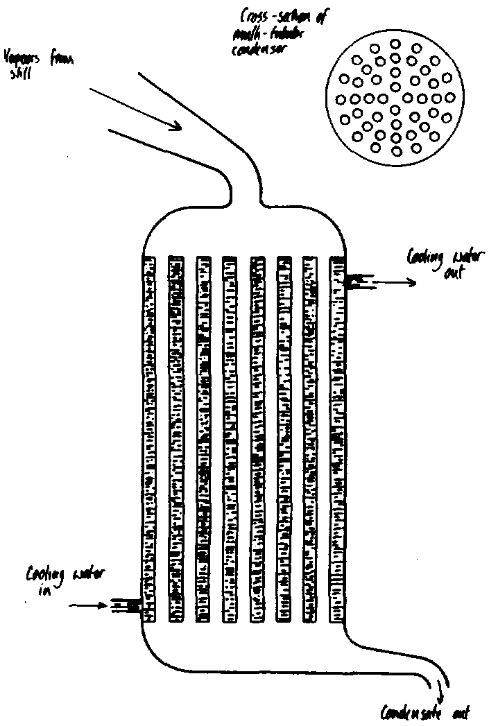 A more efficient type of condenser is the multi-tubular type shown in Fig. 6 (see Fig. 6. Multi-tubular condenser) in which a series of parallel tubes are mounted inside a cylindrical jacket through which cooling water is passed. This design provides a large surface area for cooling in relation to its volume.