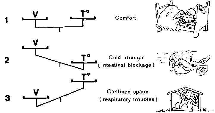 FIGURE 21.-Effect of air speed (V) and temperature (T°) on health of rabbits (Morisse, 1981)