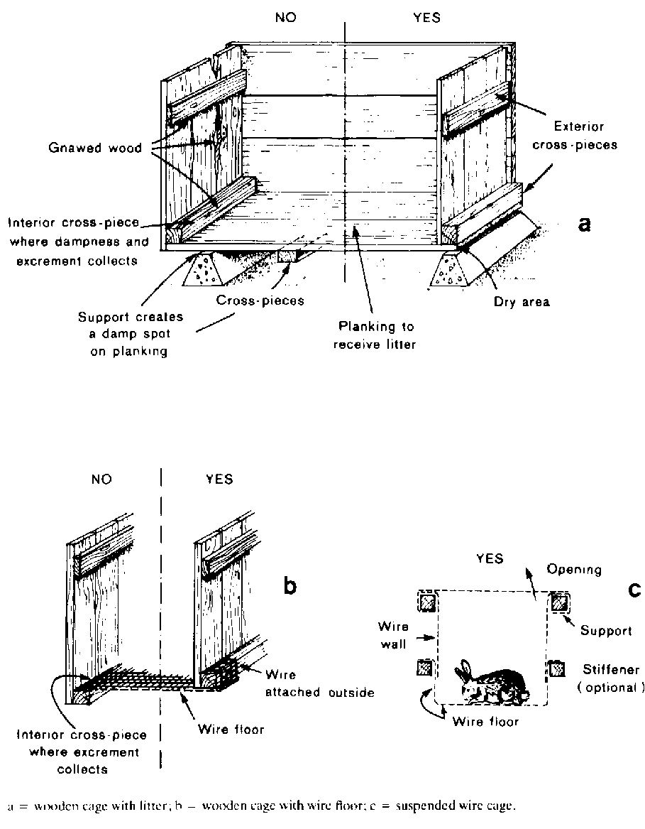 Cage systems vary in accessibility, supervision and comfort, as well as in convenience of waste removal. Straw-litter cages will be examined first. These are either single deckers (cages with wooden or plywood framework) or built on several levels (concrete cages, with watertight floor beneath straw litter). The principle is generally the same. Access is by a door in the front of the cage, usually made of mesh, or hardwood latticework that must be replaced rather often. The other walls have no openings. They must be built in such a way that the rabbits cannot gnaw them. A rabbit cannot chew on a flat wall but will slowly but surely gnaw away any protruding part of the cage. Some examples of proper wood construction are given in Figure 23. Obviously, softwoods can be gnawed more easily than hardwoods.