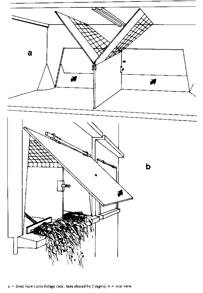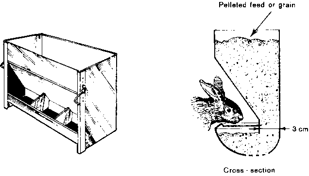 Figure 28 shows a hopper for grain or pelleted feed. Troughs and racks should be easy to fill from outside the cage without having to open the access door, but the feed must be protected from bad weather and predators. The racks should hold at least I day's ration. the hoppers enough for 2-3 days, and the mash troughs a single ration.