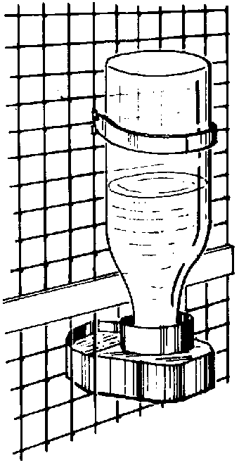 One possible improvement is an inverted water-bottle drinker. A bottle is inverted over a small trough (Figure 26), which is small enough to restrict pollution. The bottle is big so that it needs to be refilled less often and the breeder can see at a glance whether the animals' water intake is normal.