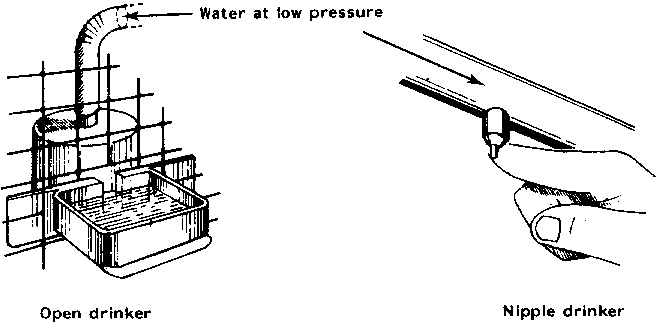 The best solution is an automatic drinker in every cage (Figure 27). The open drinker guarantees that the rabbits will be watered but it is expensive and there is a high risk of water pollution. A nipple drinker requires some learning on the part of the rabbits and wastes water. Even if there is no leak, the rabbits do not drink all the water that drips out. This can then wet litter or waste. The cost, however, is usually half that of an automatic open drinker. Above all, it ensures that the rabbits will always have clean water. A nipple drinker is the only kind that can be used if the rabbits are fed meal.