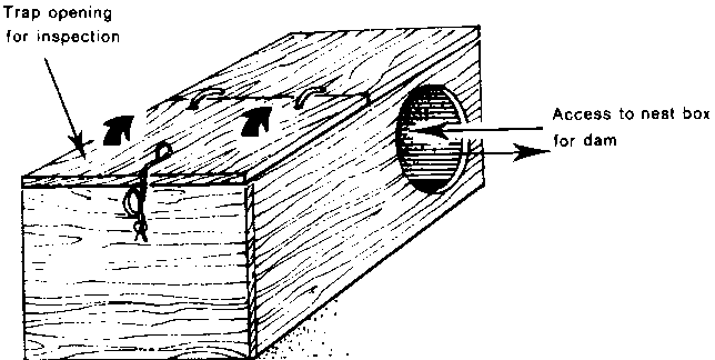 The nest box is strongly advised for rabbitries using straw litter; it is essential in modern production. The box most recommended to meet these requirements, especially the doe's comfort when kindling and nursing, is a rectangular parallelepiped at least 50 x 25 x 25 cm. If there is a dividing panel to keep the young together, at least 30 x 30 cm must be left on that side so that the mother can nurse them in comfort (Figure 29).