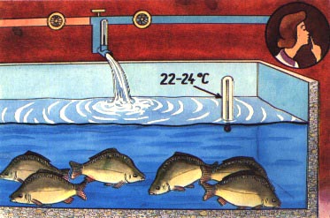 As for the females, the type of injection varies also according to the carp strain. One of these injected males is placed with the ripening females to act as an ovulation indicator (5). The other males are kept in a large storage tank with a good water supply (6).