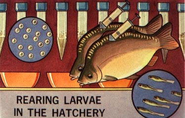 The hatching of the carp eggs occurs outside the incubation jars. The larvae are reared in larger jars until they develop into early fry, which feed on exogenous food.