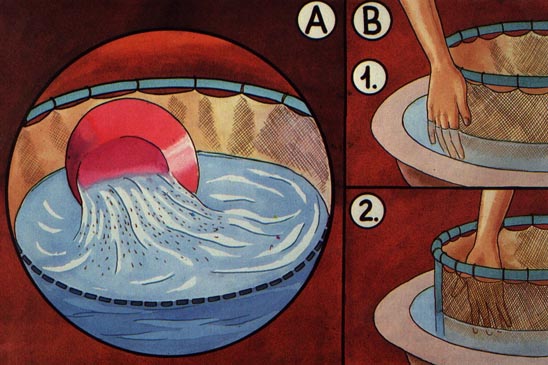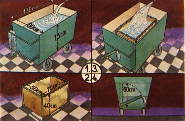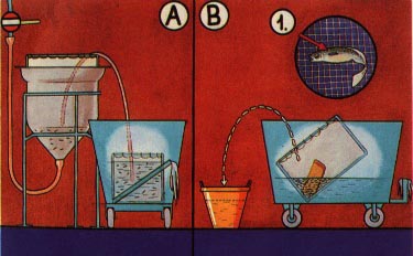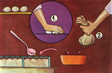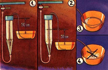 The eggs are slowly siphoned into a plastic bowl, care being taken not to damage them. (1) The head between the water in the jar and the water in the bowl should never exceed 50 cm, keeping the bowl relatively high at first and (2) lowering it gradually as the jar empties. (3) The eggs should be transferred gently directly to the bottom of the bowl (4) to avoid dropping them from any distance.