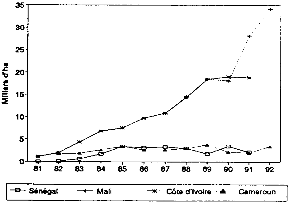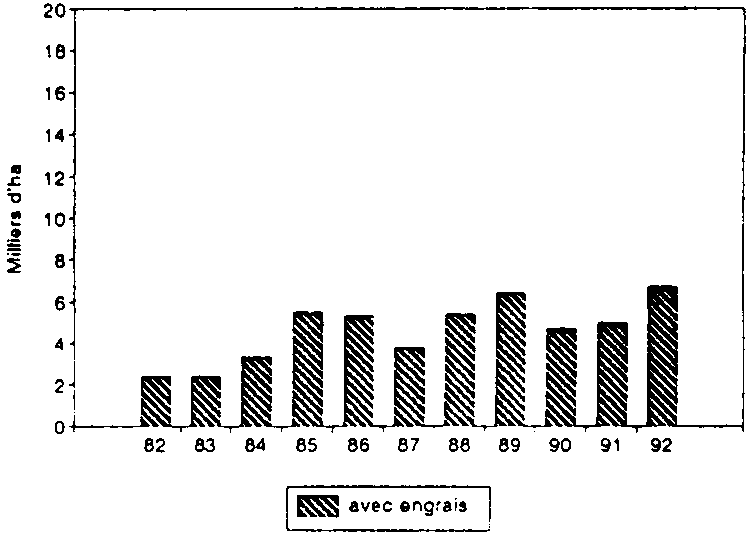 Au Sénégal et au Cameroun, l'utilisation des engrais apparaît limitée (moins de 10 000 ha en 1991) du fait d'abord de la faible extension de la surface en maïs encadré. On constate une progression rapide de la surface avec engrais au Sénégal, contrairement au cas du Cameroun où les engrais ont pourtant été subventionnés et fournis à crédit jusqu'en 1991.