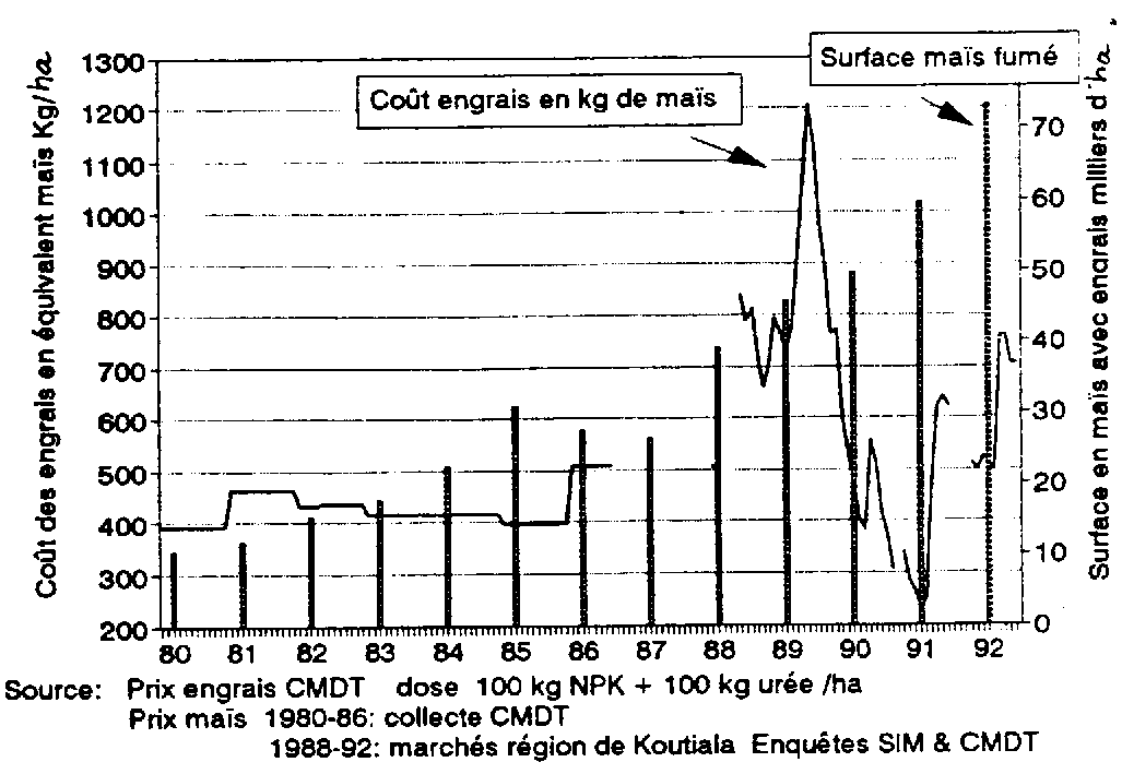 La liaison entre l'utilisation des engrais et les rapports de prix maïs/engrais n'est toutefois pas évidente. Le tassement de la surface en maïs totale et avec engrais, constaté en 1986-1987, tient sans aucun doute à la rupture du contexte économique. En 1986 intervient en effet la libéralisation du marché céréalier qui conduit la CMDT à abandonner la collecte du maïs, entraînant une grande incertitude sur le prix du maïs. Par ailleurs, le prix de l'engrais connaît une forte hausse. La reprise de l'utilisation des engrais sur maïs en 1988 est vraisemblablement stimulée par le retournement à la baisse du prix de l'engrais. Cette baisse, dont le caractère inédit amplifie surement les effets, est rendue possible par une réduction de la marge prélevée par la CMDT. De 1990 à 1992, on constate paradoxalement une évolution du prix relatif maïs/engrais défavorable aux maïsiculteurs et une forte expansion du recours aux engrais. il est pourtant bien hasardeux d'attendre de l'épandage d'engrais un gain de rendement en maïs de plus de 500 kg/ha. Une réaction probable des producteurs est la réduction des doses d'engrais; une enquête réalisée en 1993 enregistre en effet un niveau de fertilisation très inférieur aux recommandations de la CMDT. Il s'avère aussi que l'affectation de l'engrais du cotonnier sur le maïs, non pris en compte dans les statistiques courantes de la CMDT est une pratique fréquente. Cette dernière tient au fait que seul l'engrais du cotonnier bénéficie d'un règlement à crédit. Cela souligne l'importance de la contrainte de trésorerie; l'engrais du cotonnier est souvent préféré alors qu'il coûte 15 % plus cher que l'engrais pour céréales.