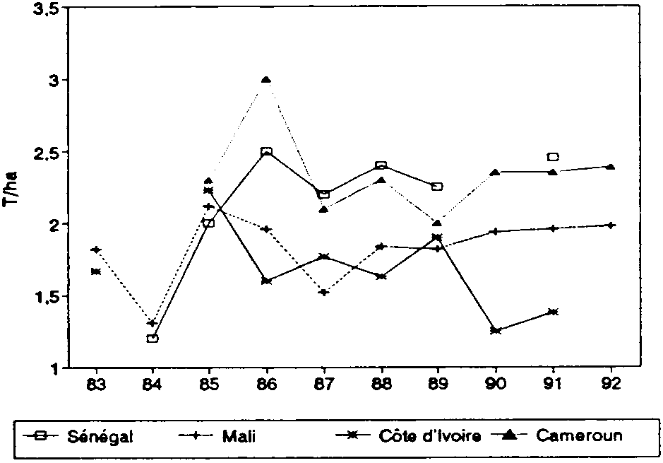 Au Mali et dans une moindre mesure, au Sénégal, l'objectif d'intensification de la maïsiculture a bien été atteint; on note une élévation des rendements en maïs encadré, parallèlement à une expansion de la surface encadrée. En Côte-d'Ivoire en revanche, on enregistre une baisse significative du rendement; cette dernière est sûrement à rapprocher de la faible utilisation des engrais. On peut toutefois considérer que les rendements en maïs dans les exploitations non encadrées sontä inférieurs, donc que la diffusion de l'encadrement des sociétés cotonnières a bien permis une augmentation du rendement moyen pour l'ensemble de la zone de savane.