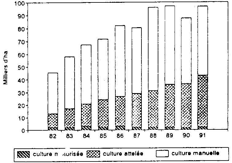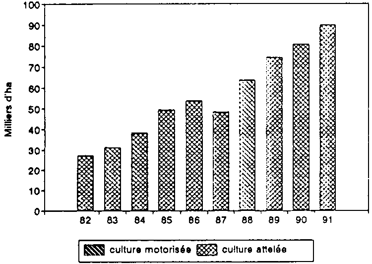 Figure 13. Superficie encadrée en maïs par la CMDT (Mali) selon le mode de préparation du sol.