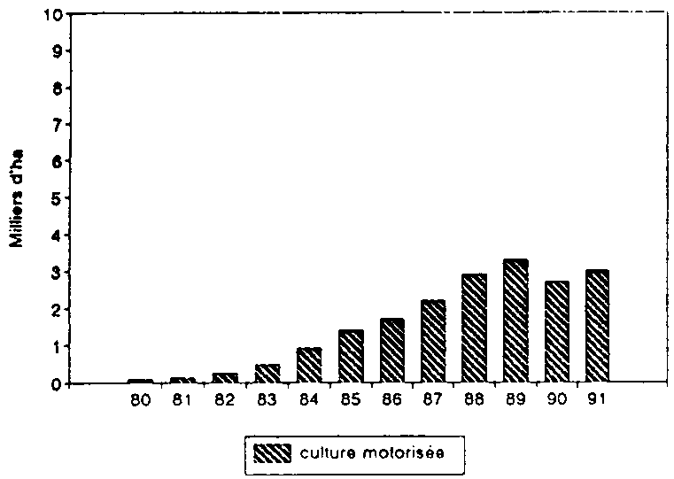La motorisation intermédiaire - avec tracteurs de faible puissance - introduite à la fin des années 70, n'a connu qu'une diffusion très limitée. Son expansion est stoppée dès les années 1986-1989 du fait d'une rentabilité incertaine, l'investissement étant ici trop lourd pour être récupéré sur la seule recette du coton. De ce fait, la culture motorisée du maïs reste marginale, même si le maïs constitue la céréale privilégiée dans l'assolement des exploitations motorisées.