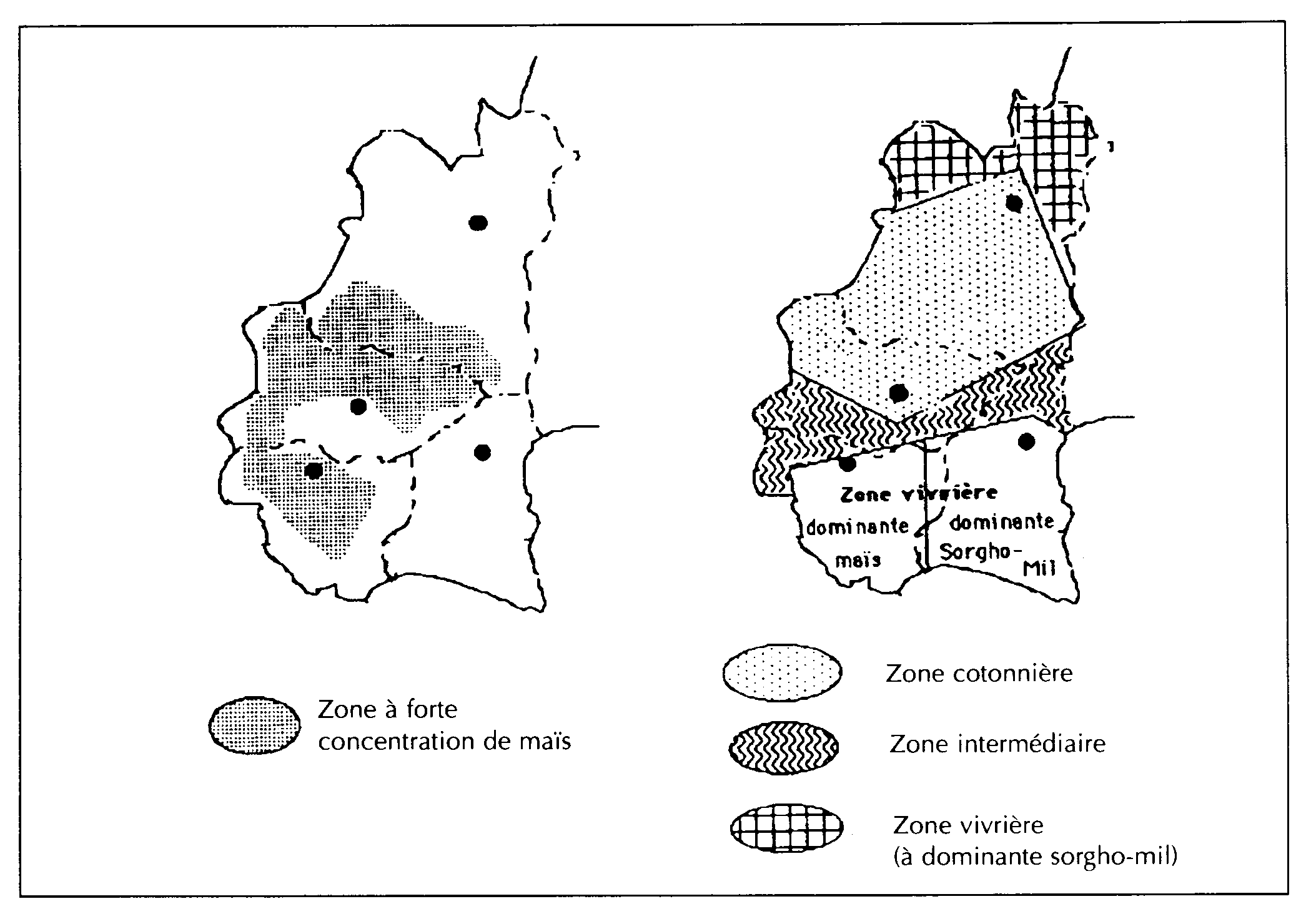 L'aire d'extension du maïs à l'ouest recoupe les isohyètes 850 à 1 200 mm et au-delà, mais sa répartition est assez inégale. L'analyse plus détaillée des statistiques permet de localiser deux zones principales de production (figure 2), le nord de Bobo-Dioulasso, correspondant à la zone cotonnière, et la région de Banfora-Sidéradougou (SIBAND et WEY, 1989).