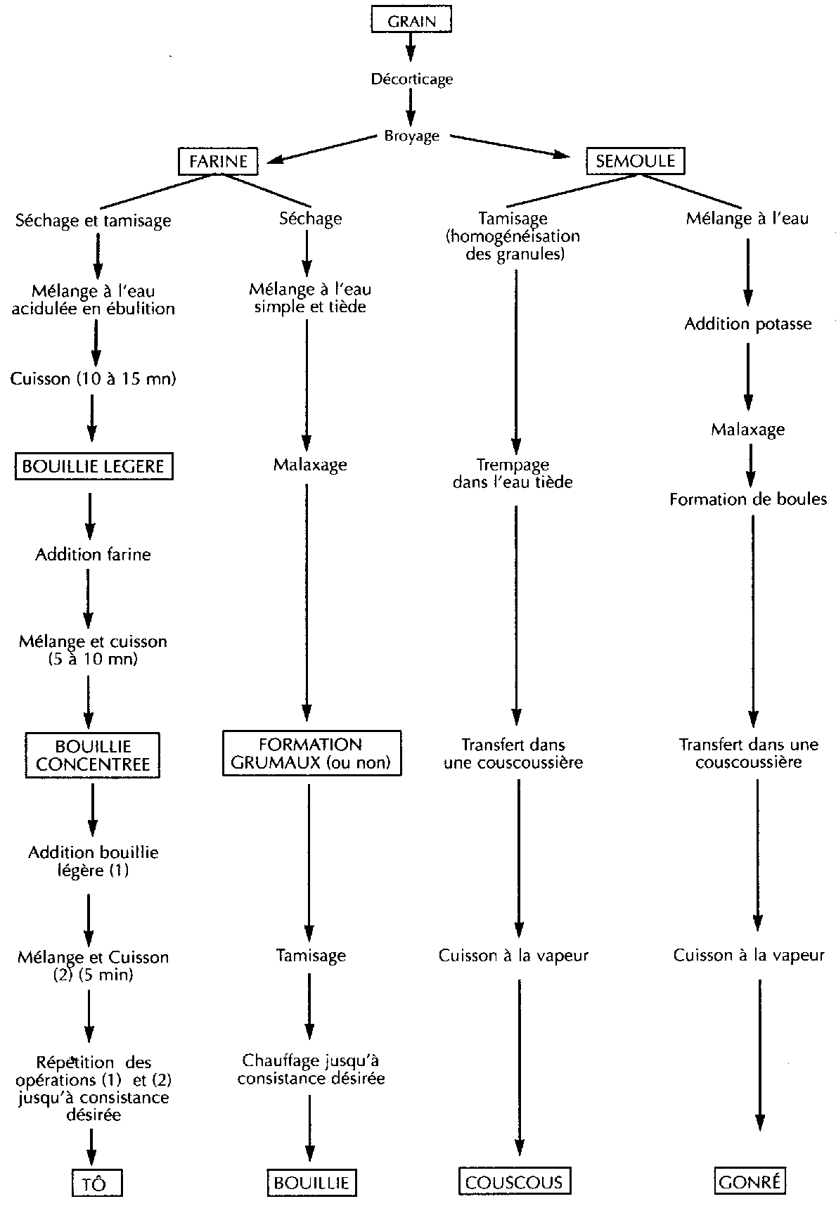 | Bouillie | Farine fine ou grossière | Porridges légers avec ou sans grumeaux résultant de la cuisson d'un mélange de farine et d'eau | 25 à 30 min | Mélangé à du lait ou du sucre |