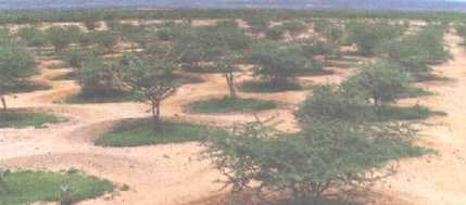 On a planté principalement des essences indigènes, mais aussi des Prosopis, comme les P. juliflora et chiliensis du Brésil qui ont été testés et sélectionnés pour leur résistance à de longues périodes de sécheresse et pour le goût sucré de leurs gousses.