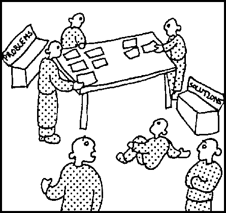 A good range of possible solutions should be available in paste-ups. A couple of inappropriate solutions can be useful to encourage the group to disagree with "set" solutions if they are not appropriate.