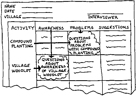 Unlike the questionnaire framework, where detailed questions are formulating ahead of time, semi structured interviewing starts with more general questions or topics. Relevant topics (such as cookstoves) are initially identified and the possible relationship between these topics and the issues such as availability, expense, effectiveness become the basis for more specific questions which do not need to be prepared in advance.