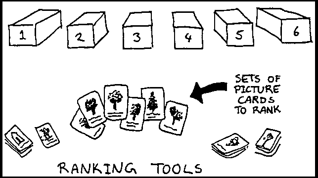 2. Design the exercise and collect the materials required: picture cards, forms, baskets, etc. Examples of Ranking, Rating and Sorting are described below: