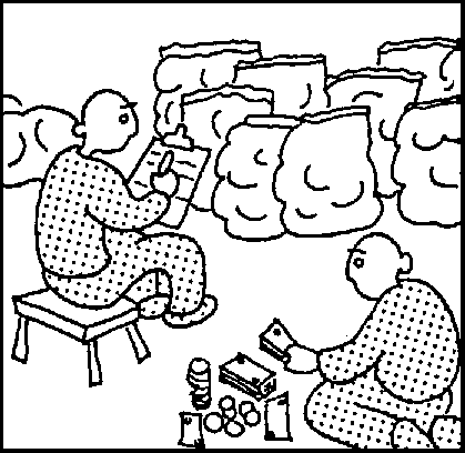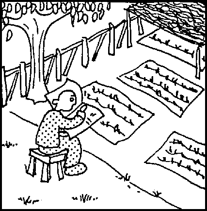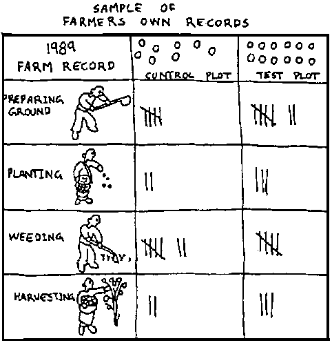 If literacy is low, drawings can be substituted for writing, and pencil strokes for measures as shown below, where time spent working in various activities was recorded. By making one mark for every half-day spent doing specific jobs, a farmer can compare the time worked on the control plot with the time spent on the test plot.