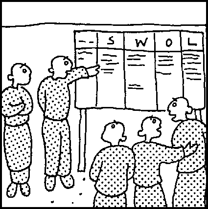 6. There are two ways to approach the S.W.O.L. Analysis, depending on the specific situation or issue. Either go through all the strengths first, then all the weaknesses, all the opportunities, and all the limitations. Or identify each strength, then each "matching" weakness, and so on. A small "test" of the tool use will help you to know which approach is going to work best in each instance.