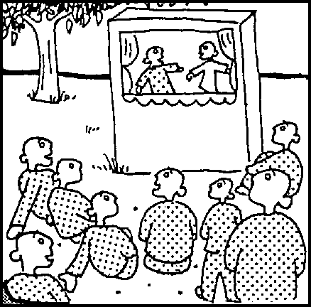 Puppet theatre has the same purpose as Popular Theatre (Tool 19), but because the puppets are not viewed as "real people", they can often deal with sensitive situations and more easily obtain feedback from the audience.