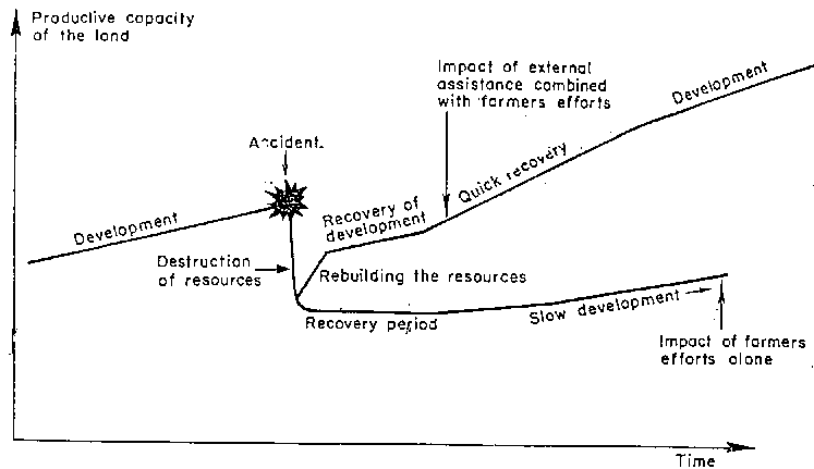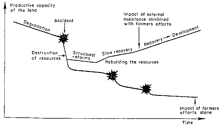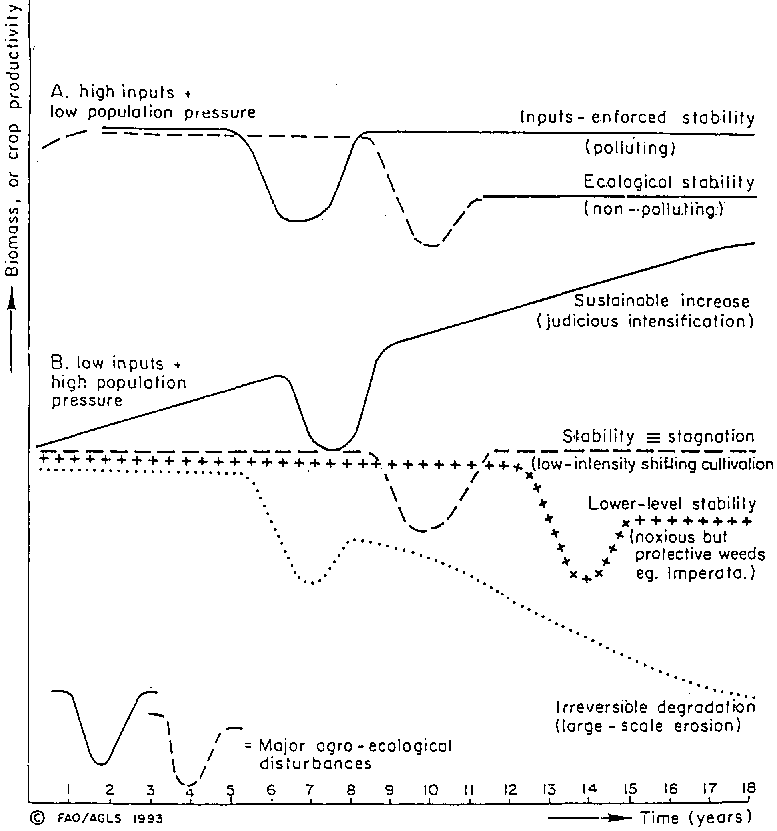 Fig. 2 Some concepts of resilience of land and its productivity, comparing the situation in some industrialised countries (A) with that of most developing countries (B).