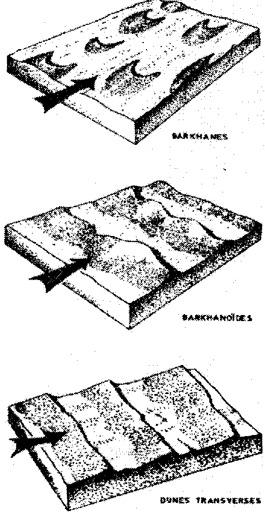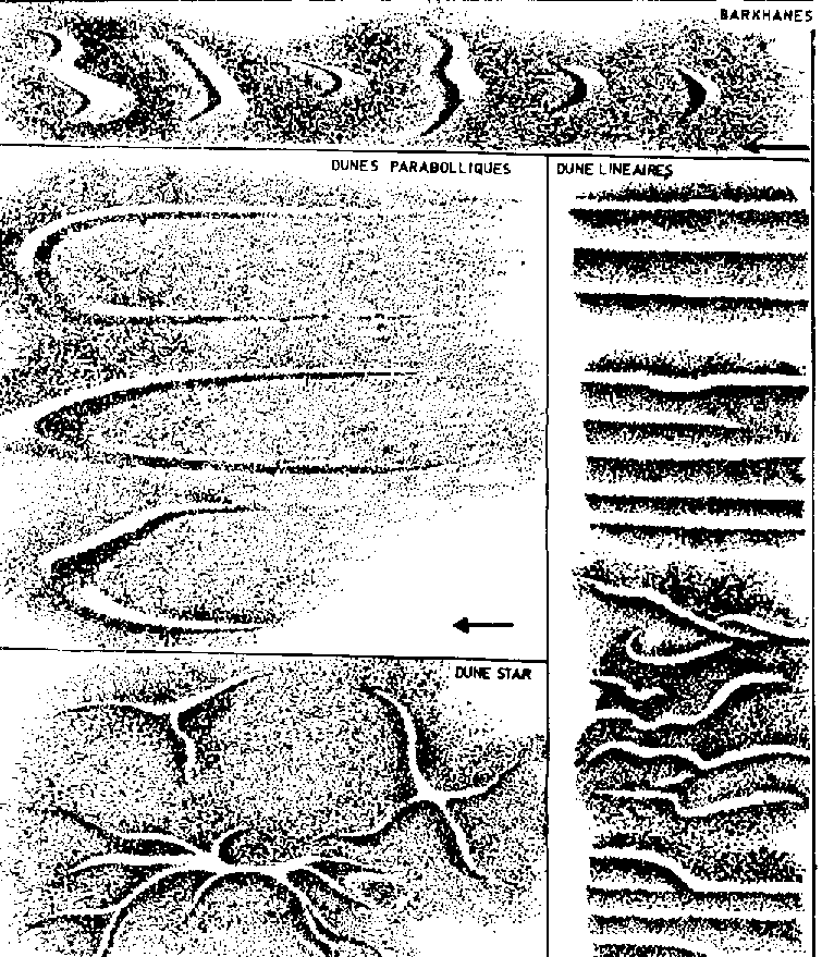 Principaux types de dunes. La Flache indique dircetion et sens dominants du vent