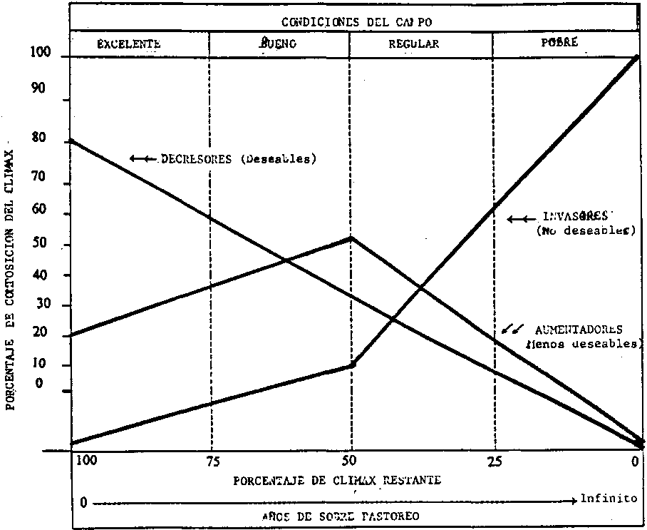 En la figura 11 se da un ejemplo de retrogresión. Los animales comen, en primer término, las especies que más les agradan, las que por lo general son las más nutritivas y productivas y las mejores conservadoras del suelo y del agua. Consecuentemente, estas especies disminuyen con el sobre-pastoreo continuado y se las llama "disminuidoras" o "deseables".