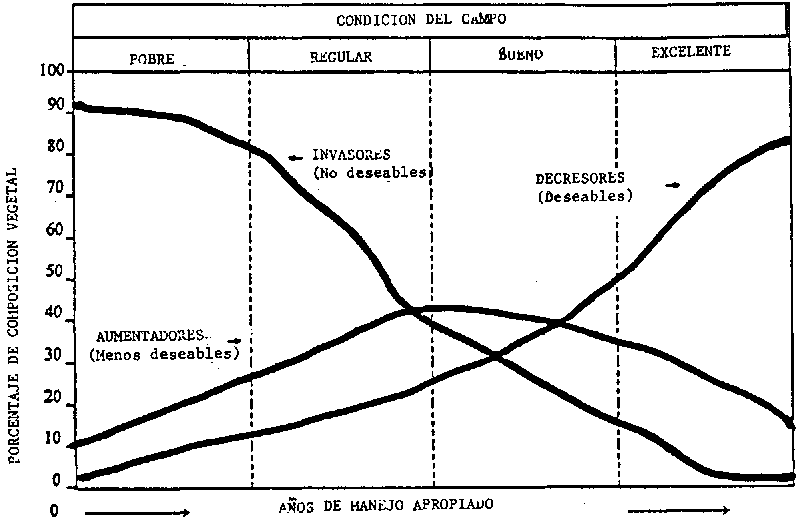 Cuando el suministro de especies deseables escasea, los animales buscan las siguientes especies de su agrado, las que por lo general son menos productivas y nutritivas y menos deseables con respecto a la conservación del suelo y del agua. Mientras decrecen las especies deseables, estas especies aumentan hasta cierto punto, pero con la utilización excesiva continuada, también se debilitan y mueren. A estas especies se las llama "aumentadores" o "menos deseables" (figura 11).