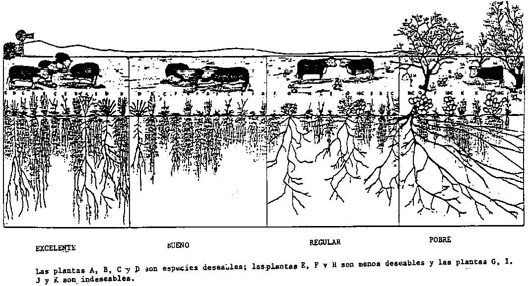 Las características generales de las cuatro clases de condición de pastizal se ilustran en la figura 13. La condición excelente está dominada por especies deseables altamente productivas, agradables al paladar y de raíces profundas. Existen unas pocas menos deseables. La capacidad de pastoreo es máxima. El terreno está bien cubierto y el suelo está lleno de ces deseables. El ambiente es estable y no hay desertificación.