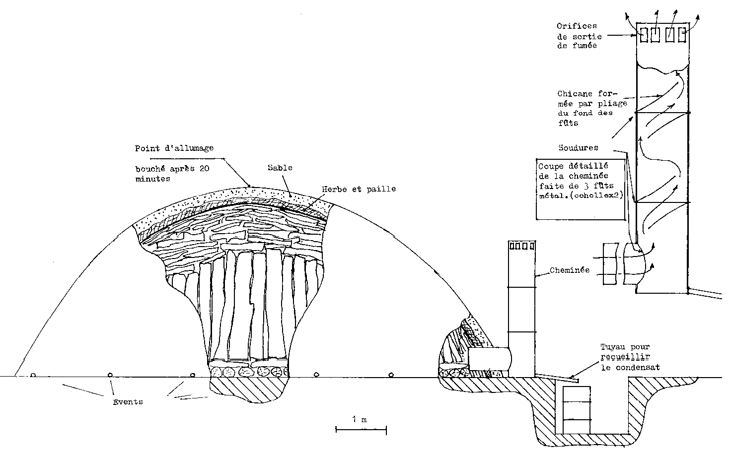 La meule est couverte avec de l'herbe et des broussailles, puis du sable ou de la terre limoneuse. La cheminée est placée sur le pourtour, comme le montre le schéma' l'ouverture à la partie inférieure étant en communication avec la base de la meule.