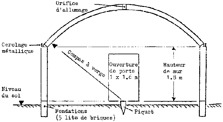 La figure 5 montre le dessin de ce four, qui est construit entièrement en briques. On utilise comme mortier un mélange de boue et de poussier de charbon, sans aucun fer de support en général. Le four a l'aspect d'un igloo hémisphérique, d'un diamètre d'environ 6 m (entre 5 et 7m). Les dimensions des briques sont de 24 x 12 x 6 cm. Pour la construction d'un four il faut compter 5500-6000 briques, compte tenu des briques cassées en cours de travail.