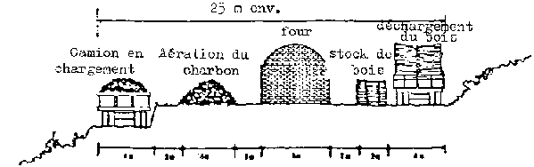 Les fours doivent être construits sur une plateforme aménagée de façon à permettre de charger le charbon après repos directement dans les camions, qui doivent arriver à un niveau plus bas (voir fig. 10). |